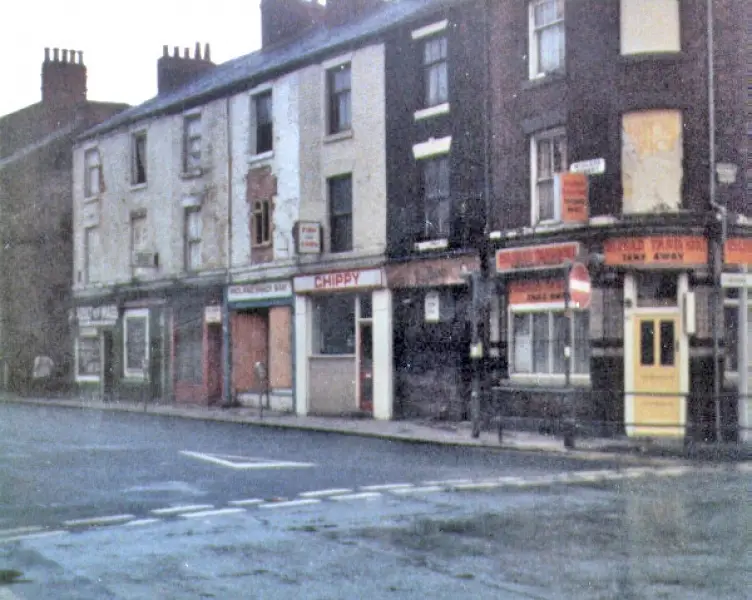 Beyond the entrance to Perry Street are the last few properties in the Stanley Terrace development; purpose-built between 1896 and 1899 as shops with accommodation above, they were referred to as West Park Row in an 1896 trade directory. All of the property, including Ruskin Street, Perry Street, and the many small terraces behind, were built on land belonging to the Broadley family, known as Maiden Hill Farm.