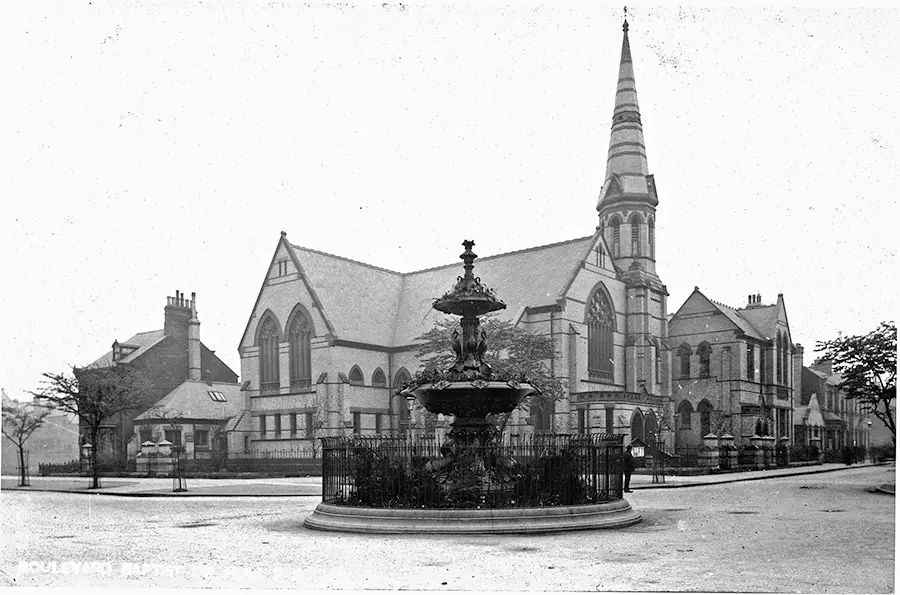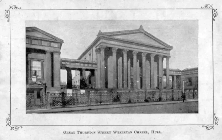 Great Thornton Street marks the meandering line of a much older route known as Gallows Lane leading to Love Lane, and the Waverley Street (formerly Pinfold Lane) area, and the site of the old town gallows. The lane was gradually built upon from the south, eventually becoming Great Thornton Street by c.1845. The street cut through land owned by Alderman John Porter, who had married a Miss Thornton; hence the street’s name. The “Great” in Great Thronton Street was possibly added to distinguish it from an other Thornton Street in Drypool. Amongst the notable buildings in Great Thornton Street, was the Great Thornton Street Chapel, opened by the Primitive Methodists in 1842. It was designed by architect H F Lockwood, in the Greek revival style, and had seating for 1,300. Its stone façade, hid more a modest brick shell, built at a cost of £7,000. At the time it was one of Hull’s outstanding buildings, but was sadly almost destroyed by a fire in 1907; a small section survived until c.1950. A new hall was built in 1908/09, on the site of the damaged chapel, known as Thornton Hall. Designed by Gelder & Kitchen and built at a cost of £18,250, the new hall seated slightly more, with seats for 2,000. The new hall was destroyed in the air-raids of World War Two.