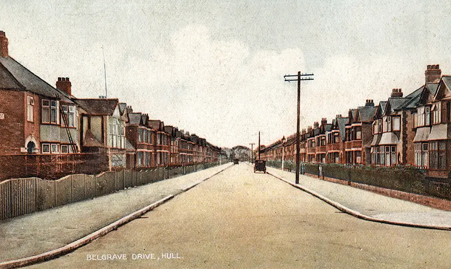 The Belgrave Drive estate was laid-out c.1928 cutting through the boundary of two old fields, the East Field and the West Field, which gace thier names to the streets built either side of Belgrave Drive. The houses followed the design of the other estates laid out nearby in the Boothferry Road and North Road development areas, and remain relatively unaltered to the present day.